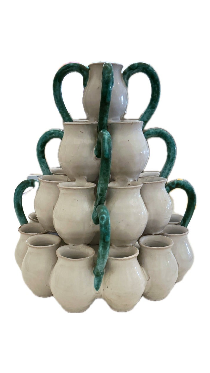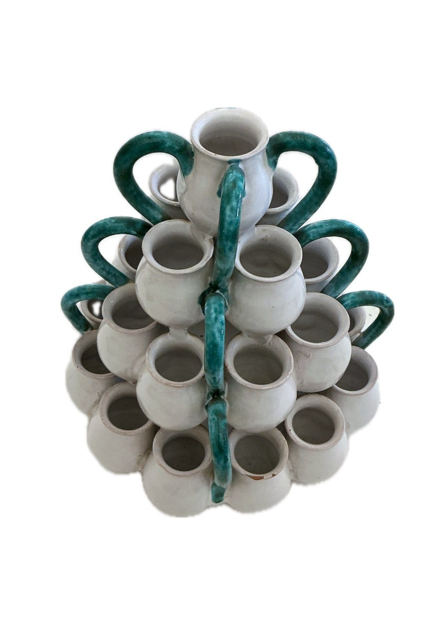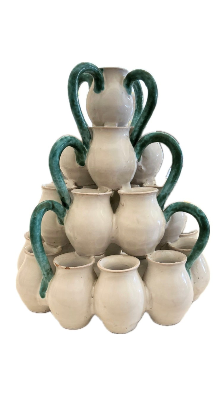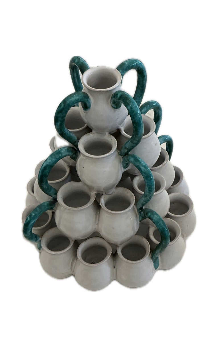 Il Multivaso Teresa Cercava è una composizione piramidale di piccoli vasi bianchi, arricchita da manici turchesi che aggiungono un tocco di freschezza. Perfetto per chi ama un design originale e un po’ giocoso, trasforma ogni fiore in una piccola opera d’arte da ammirare.
